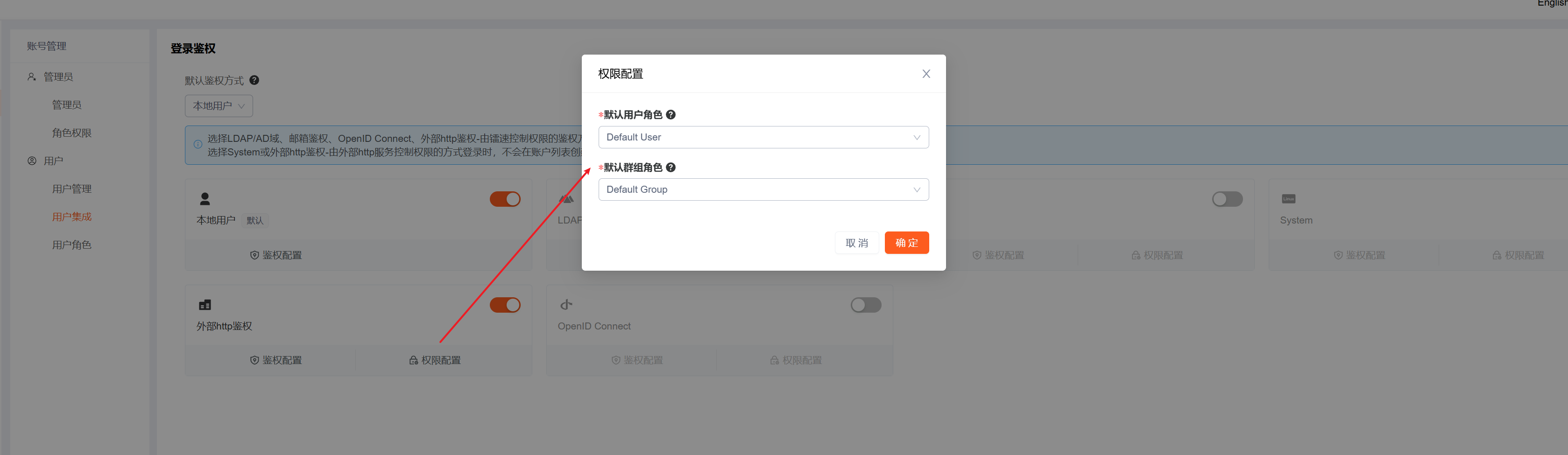 选中已经配置好的集成方式,点击【权限配置】,即可配置新建用户的默认角色权限。
